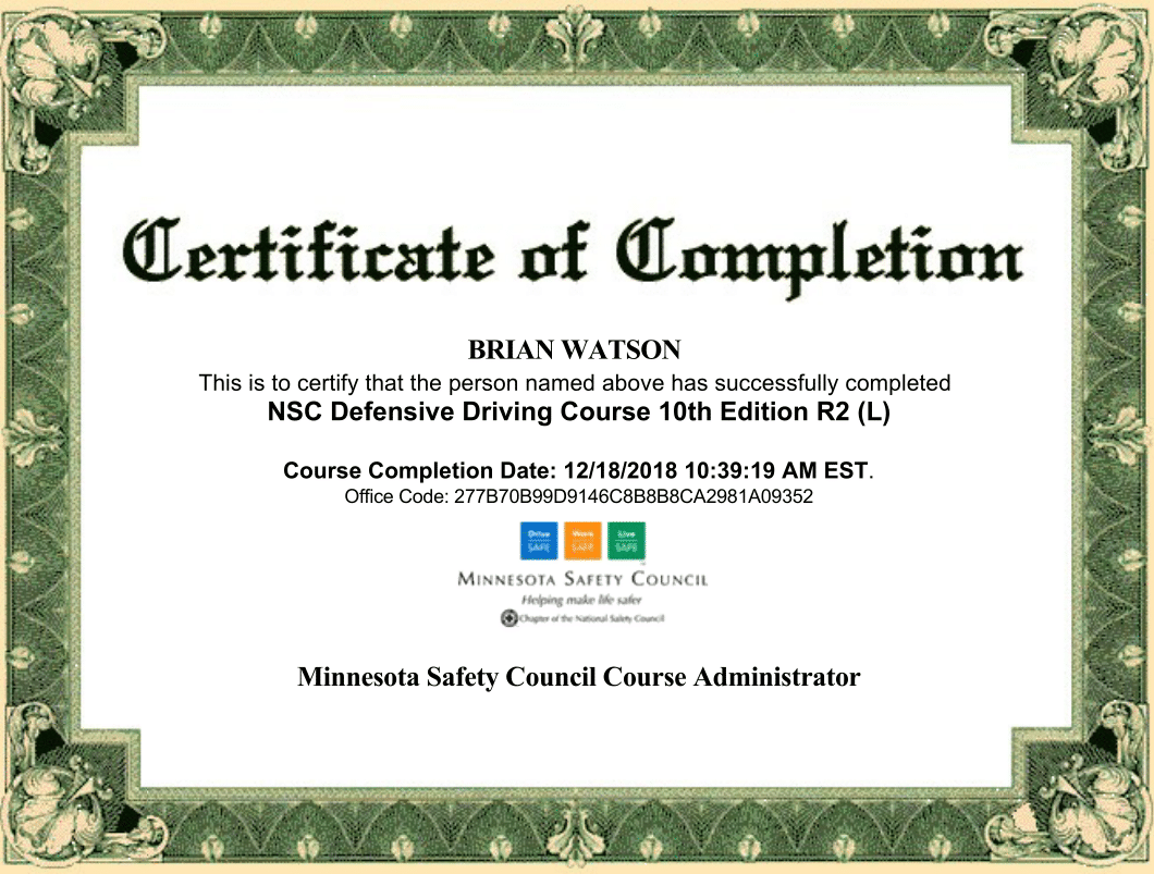 National Safety Council Defensive Driving CourseI have completed the National Safety Council Defensive Driving Course 10th Edition.